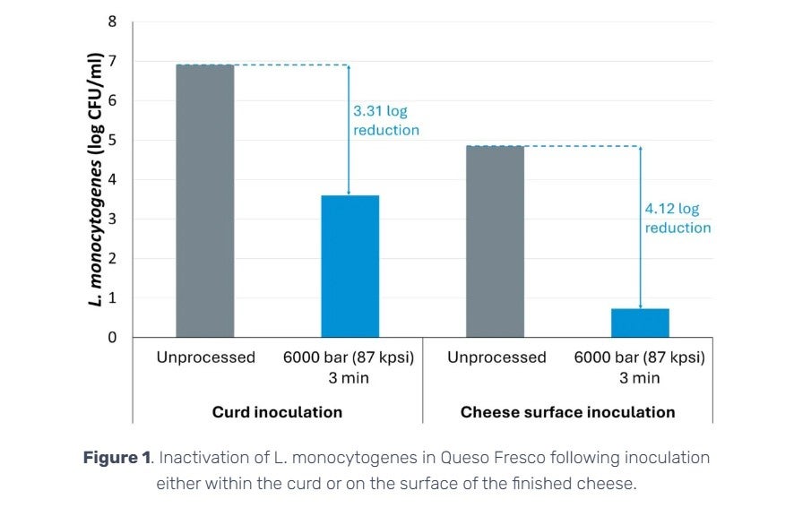 For example, in a commercial starter‑free fresh cheese, Evert‑Arriagada et al. (2018) evaluated monocytogenes at 6000 bar (87 kpsi) for 5 min and reported a 4.4 log10 reduction following HPP treatment.