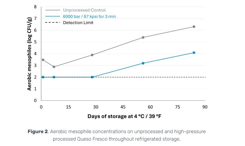 Queso Fresco made from pasteurised cow’s milk subjected to 6000 bar (87 kpsi) for 3 min achieved a shelf life of up to 84 days at 4°C (39°F), whereas unprocessed controls reached an aerobic mesophile concentration of more than 5 log10 CFU/g after 54 days. Therefore, HPP extended the shelf life by 50% (Figure 2) (Tomasula et al. 2014).