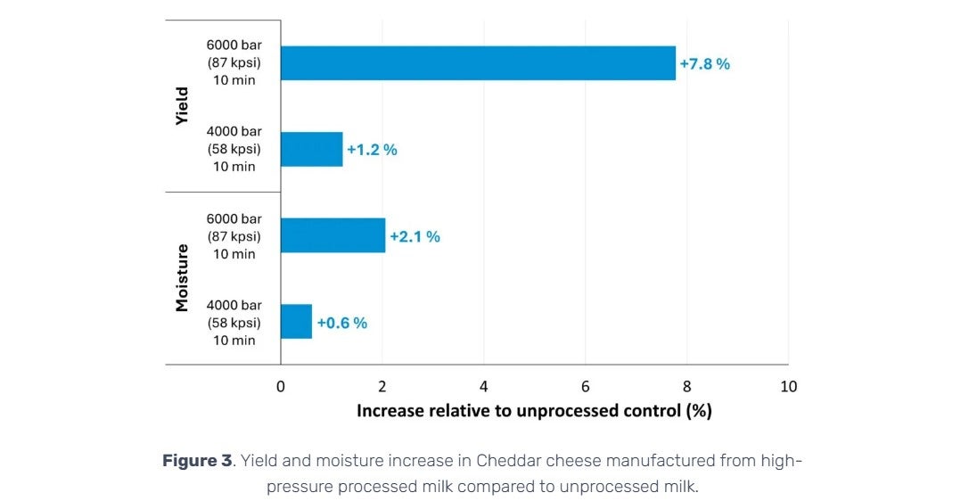 In fresh cheese production, Molina et al (2000) found that using milk treated with both heat pasteurisation (65 °C / 149 °F for 30 min) and HPP (4000 bar / 85 kpsi for 15 min) increased cheese yield by 20% over heat pasteurisation alone, with better coagulation and texture also noted.